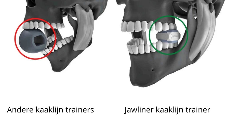 There are essentially two different types of jaw trainers: The most common jawline trainer is used in the front of the mouth between the incisors. The problem: Incisors are naturally designed for cutting food, not for chewing hard, resistant foods, so they are not at all suited for the high pressure of a jaw trainer. This incorrect use puts unnecessary strain on the incisors and can, in the worst case, lead to serious long-term damage. The JAWLINER, on the other hand, uses the molars to chew. The molars are naturally designed to chew hard, resistant foods. That is why they are ideal for resistant jaw muscle training.