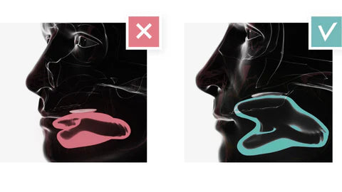 Plak de Jawliner® Mouth Tape in het midden van je lippen en druk deze vervolgens stevig naar buiten toe, richting de randen van je mond.